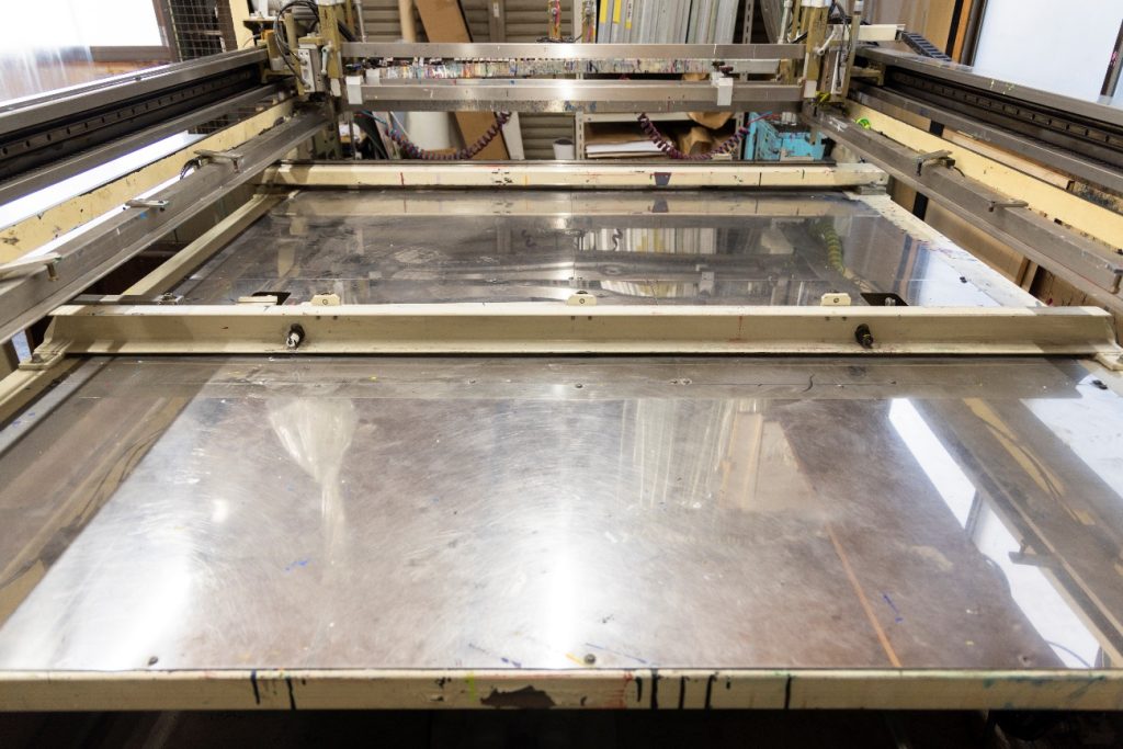 藤井氏:シルクスクリーン印刷は、メッシュ状のスクリーン版に色を通すための孔を開け、スクイージーと呼ばれるヘラで孔に一色ずつ色を押し込んで印刷する印刷方法です。印刷作業はすべて人が手作業で行います。原稿制作後、版のテンプレートとなる「版下(はんした)」を作成し、色ごとにスクリーン版を製作(製版)、インクを調合し、看板などの素材に直接印刷していきます。昔は「版」に絹を使っていたのでシルクスクリーン印刷(シルク印刷)と呼ばれているんですよ。